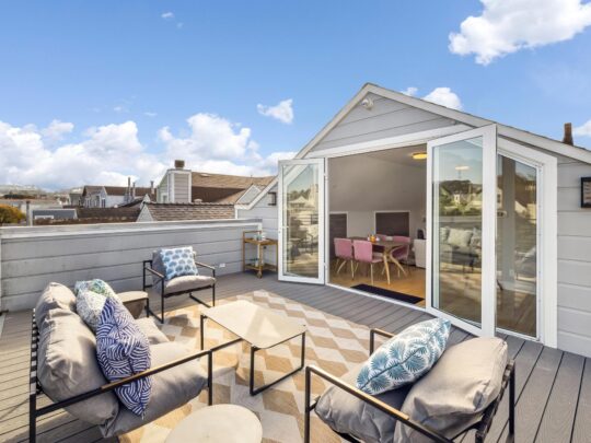 - Top floor features a large family room that leads to an expansive roof deck